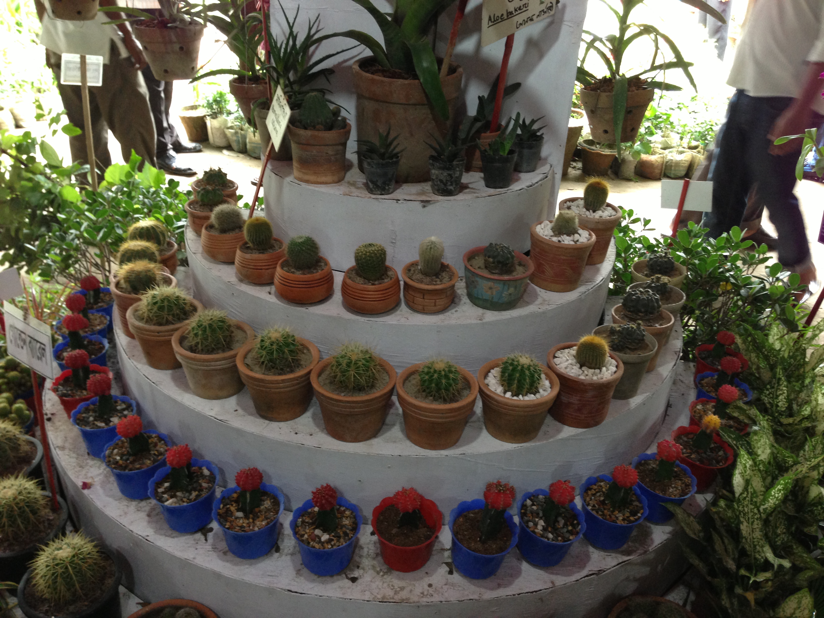 The fairground was close to the National Parliament Building and was spread out like a square. I took a clockwise route from the entrance. There was no particular organization in the type of vendor stalls or what was being displayed although I did notice a lot of different kinds of fruit trees among the first group of vendors. What I found fascinating was all the different fruit trees in dwarf form yet the fruits were of normal size. I was particularly amazed by the mango trees growing in barrels but bearing a large number of mangoes. Some of the other fruit trees on display consisted of several varieties of citrus, guava, papaya, custard apple, banana, date, coconut, palm and those that I do not even know the names of. The vendors went all out and displayed everything from flowering plants to house plants, aquatic plants, cacti and bonsai. A certain section of the fair did display pottery for plants and some stalls also carried small fish. Most of the stalls had both an indoor and outdoor section and the outdoor section stretched out and was packed with plants and trees. The fair did attract a respectable number of plant lovers.