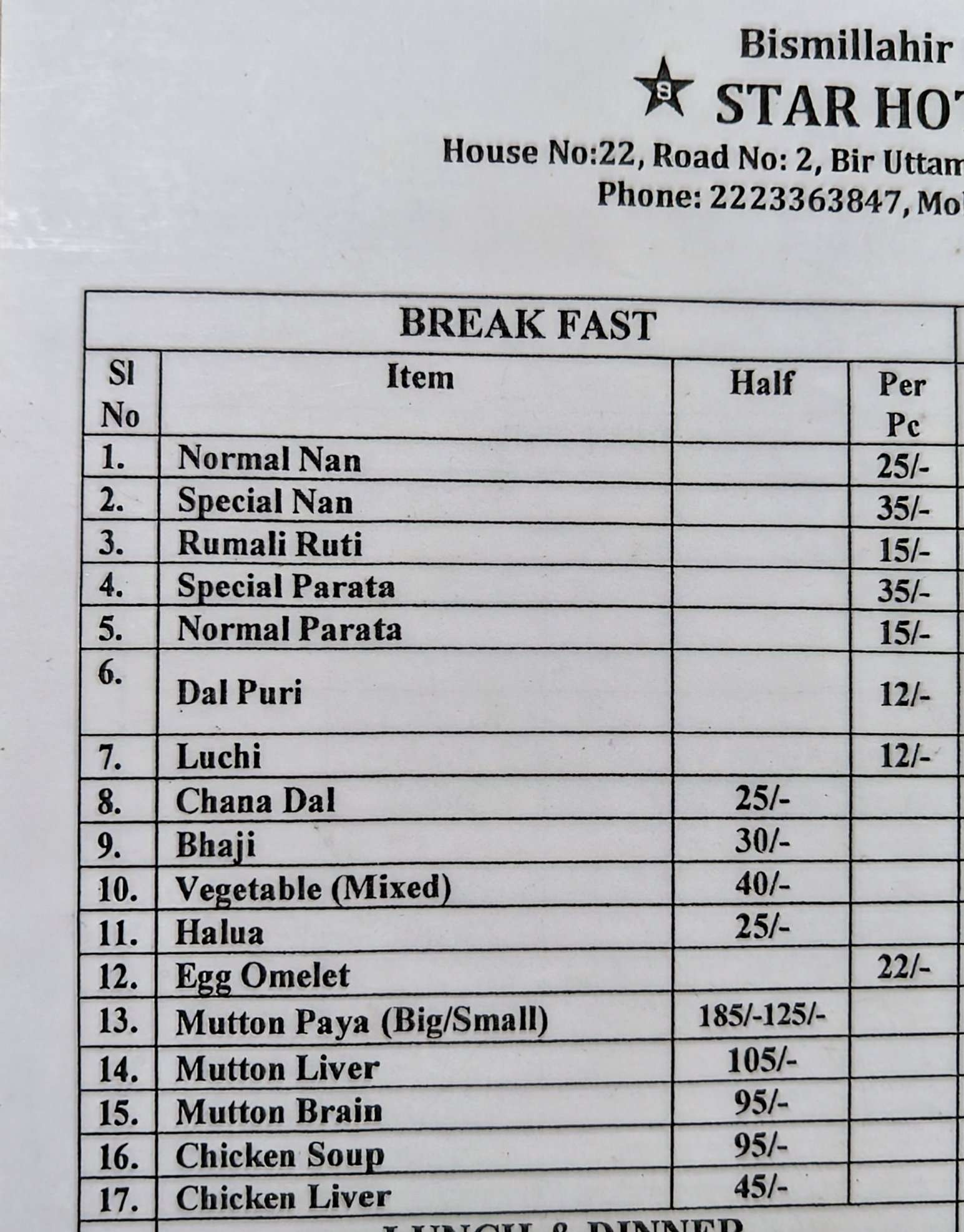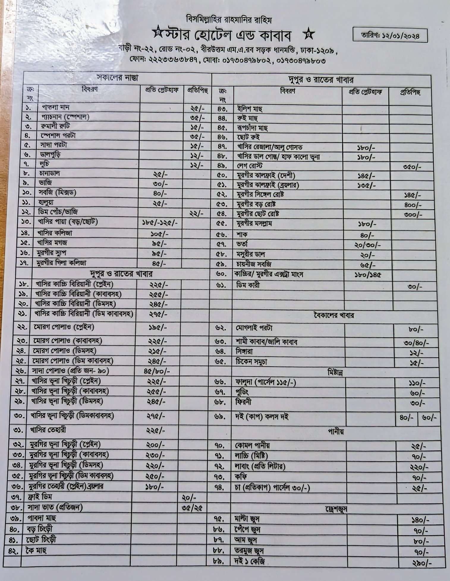 Although all the tables were occupied, it did not take long to seat our party of six people. The staff were attentive and cleaned our table promptly. We got comfortably seated and were handed the Star Kabab menu. I have visited this establishment several times before for both breakfast and lunch but was never given a menu on any of those occasions. The menu included a single page consisting of breakfast, lunch & dinner, snacks, desserts, and drinks section. One side was printed in English while the other side was printed in Bengali.