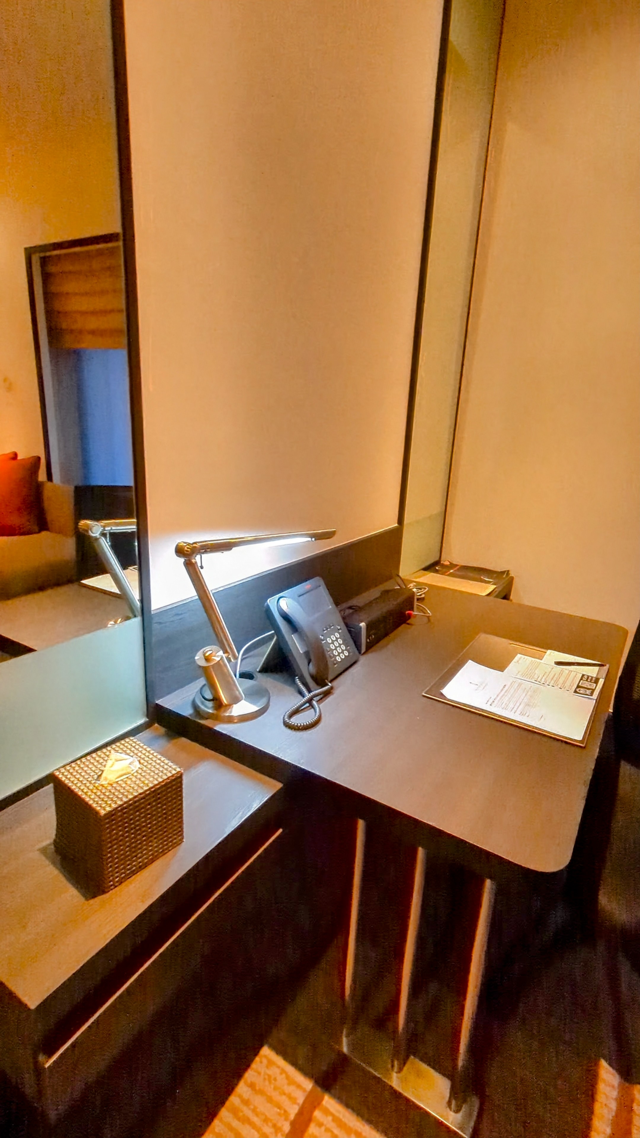 As I entered my room unsure about what to expect, I was pleasantly surprised at what met my eyes. The room was neatly decorated and had a rich vibe. The bathroom was located on the right side of the entry way. Walking past the bathroom, the remainder of the wall in the passage on the right side had top to bottom mirror. On the left side of the passage was the closet space which was quite accommodating. As I walked past the closet, I could see the entire room with a large comfortable bed, a working desk with ergonomic chair, and a small sofa located next to the window. The window did not offer any special view but it was completely unobstructed.