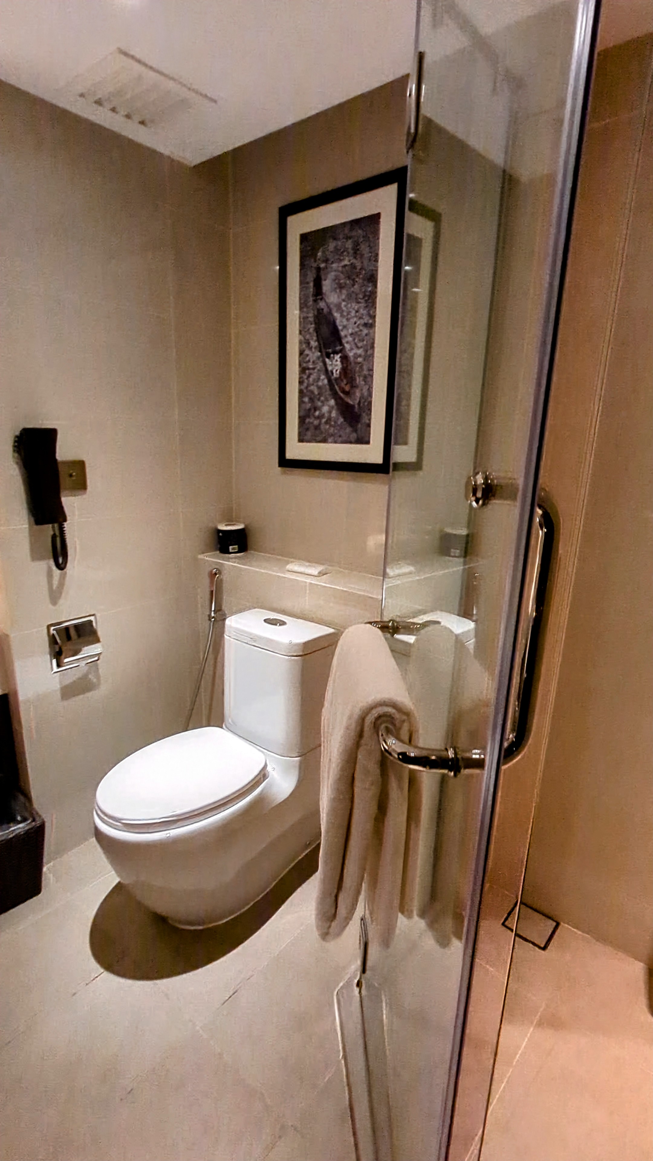 The window had both automatic curtains and blinds which could cut off the light completely from outside. Among the amenities in the room were a large screened tv, writing pad and pen, safe box, and coffee and drink station with complementary bottles of water. The bathroom was stocked with usual toiletries such as soap, shampoo, conditioner, lotion, etc.