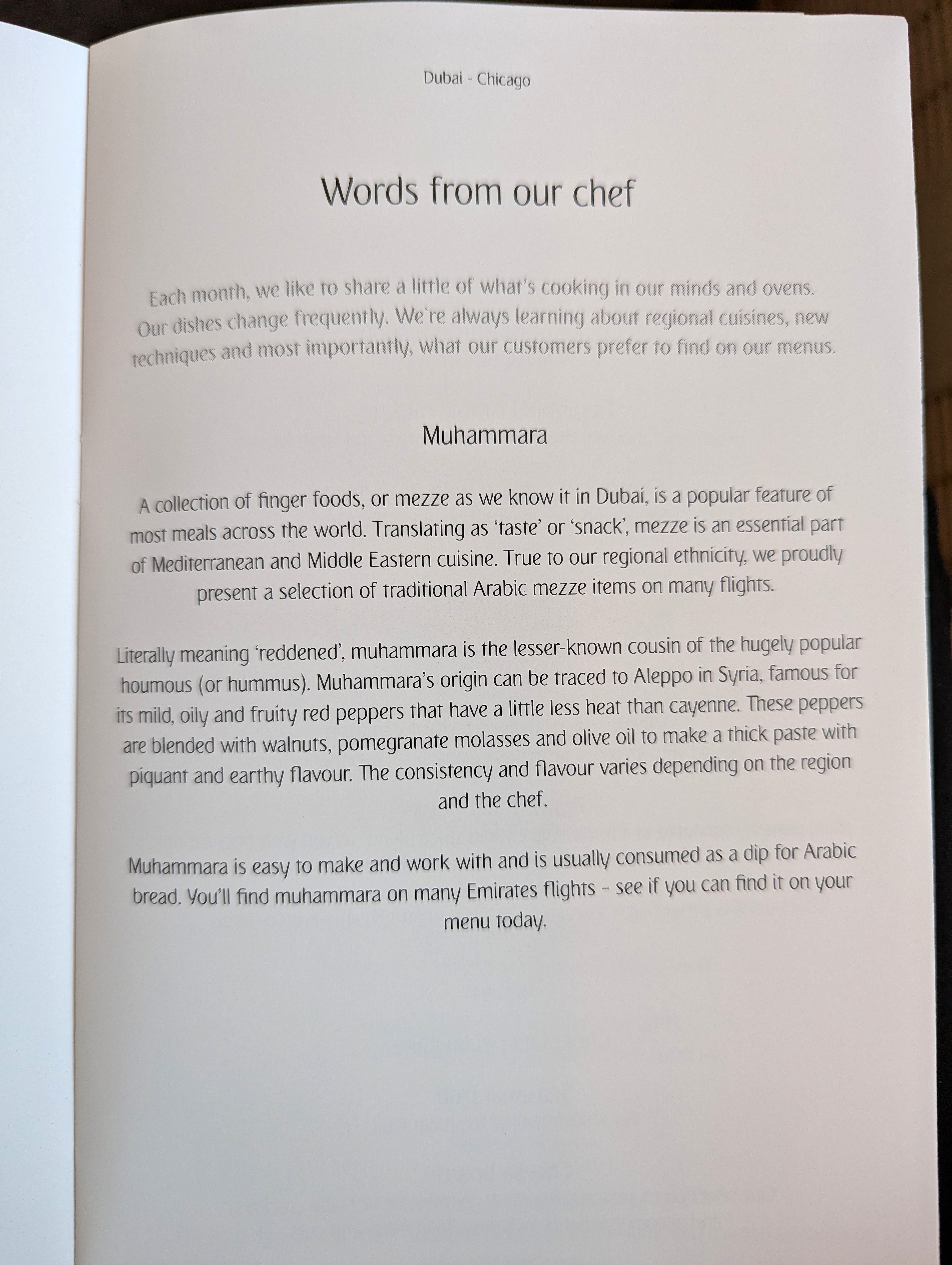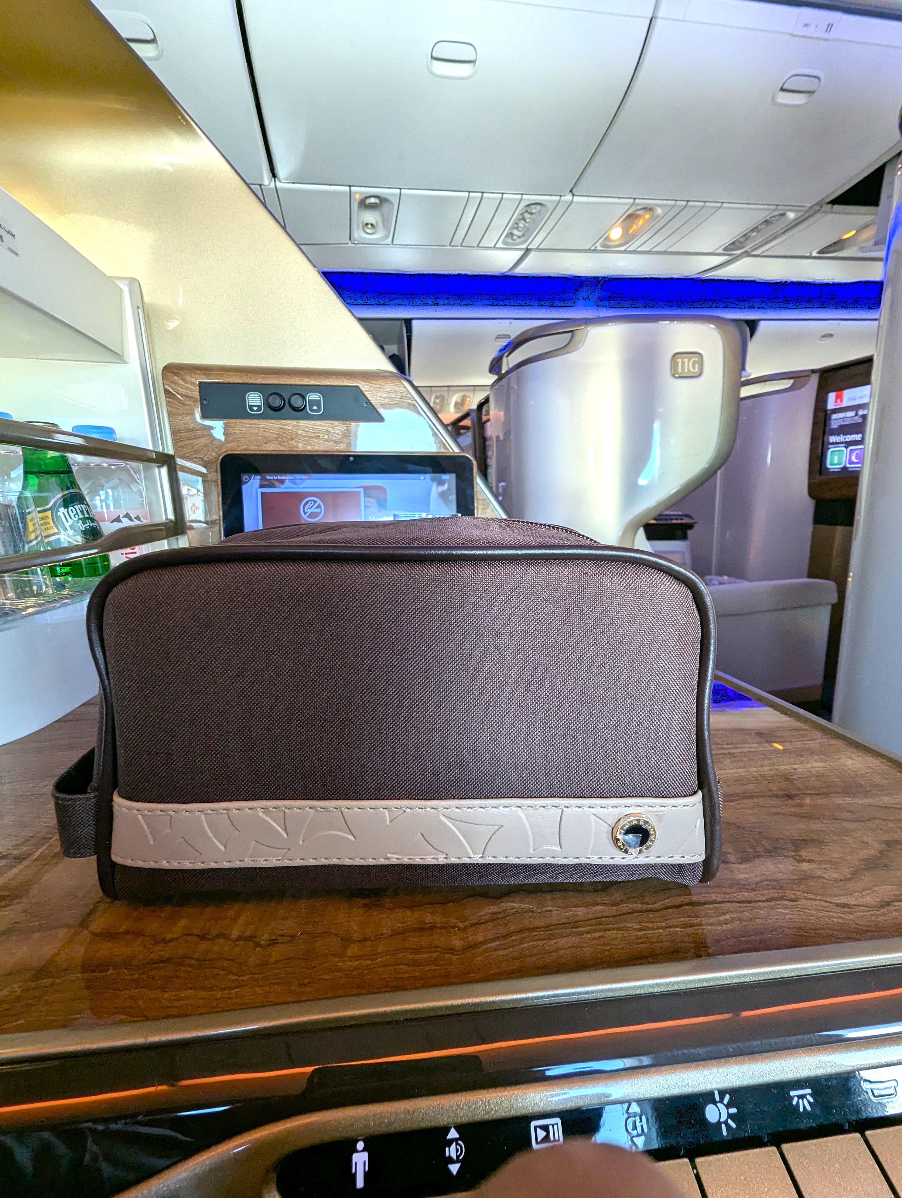 As soon as I settled in my seat, a flight attendant stopped by with a tray of welcome drinks. I chose the grapefruit drink and it was very refreshing. As I was enjoying my drink, another flight attendant came by with hot towels which is a nice touch. By this time, I was already relaxed and starting to enjoy every moment of my flight. Soon, a flight attendant stopped by and introduced herself and handed me the meal menu. I was also offered an amenity kit. It is always such a pleasant experience to interact with Emirates flight crew. They are so professional and cordial at the same time and I always enjoy chatting with them.