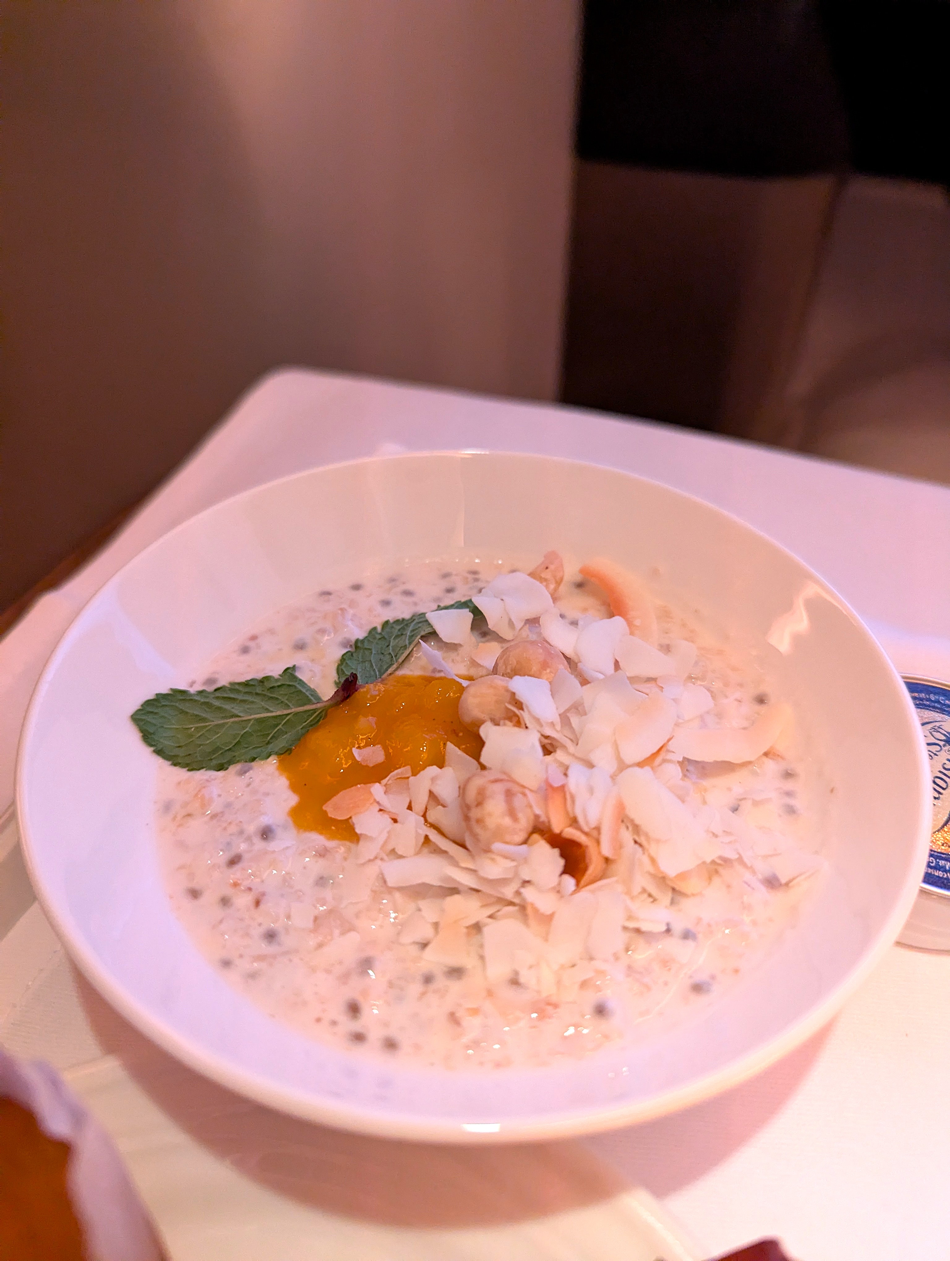 As time started winding down and we were getting close to Chicago, the crew started making preparations for brunch which was the last meal of the flight. I selected the oatmeal and chia in coconut milk for my appetizer and scrambled eggs with chives for my main course. The brunch came with a croissant but I did ask for a blueberry muffin. Although the oatmeal was not bad, the coconut milk tasted unfamiliar to me and I probably will not order it in the future. The scrambled eggs came with a grilled beef steak but it was too plain for my taste. Perhaps adding a little salt and pepper when cooking the meat might have made it taste better. However, it was a wholesome meal and I felt quite full and satisfied.