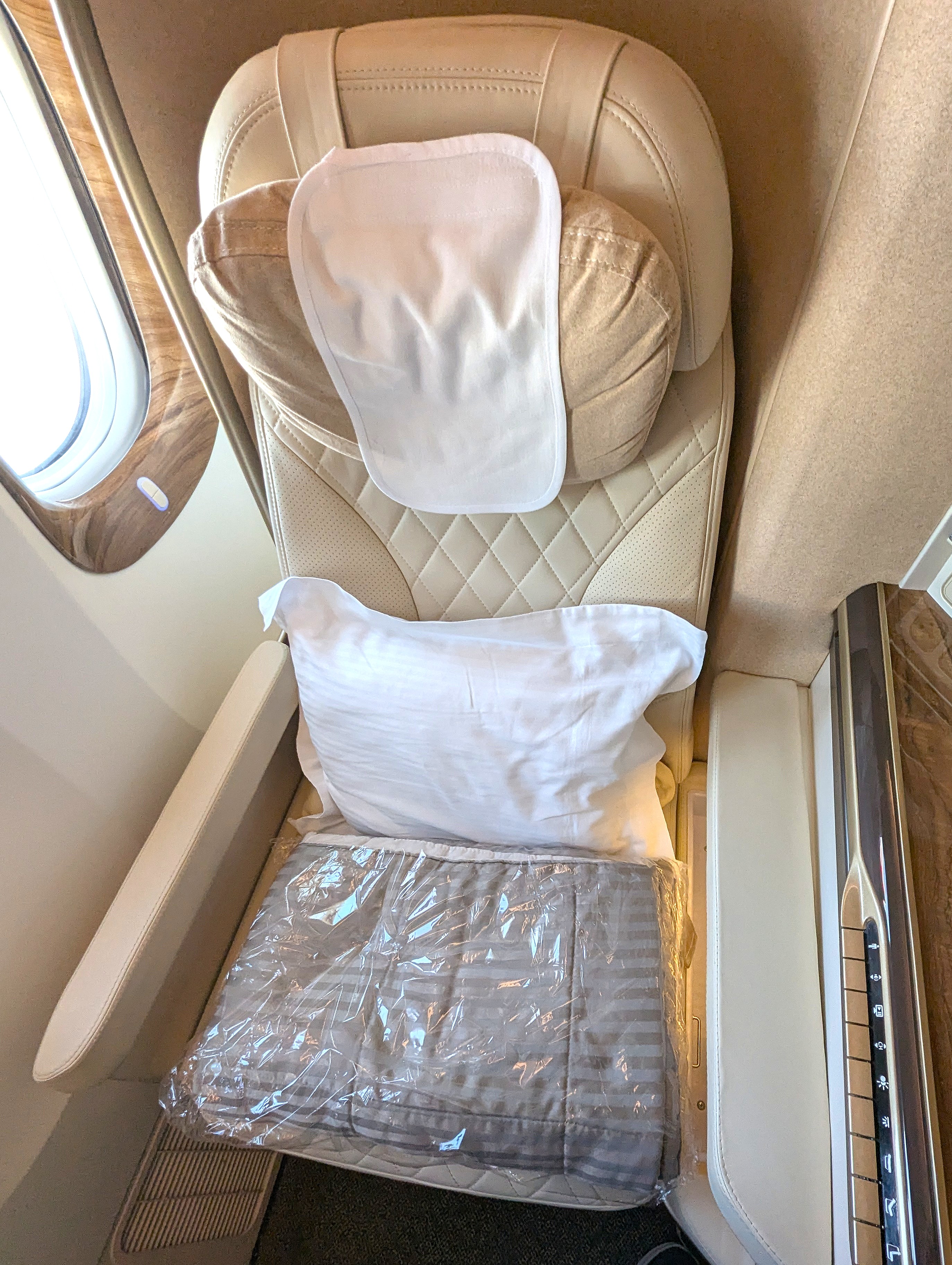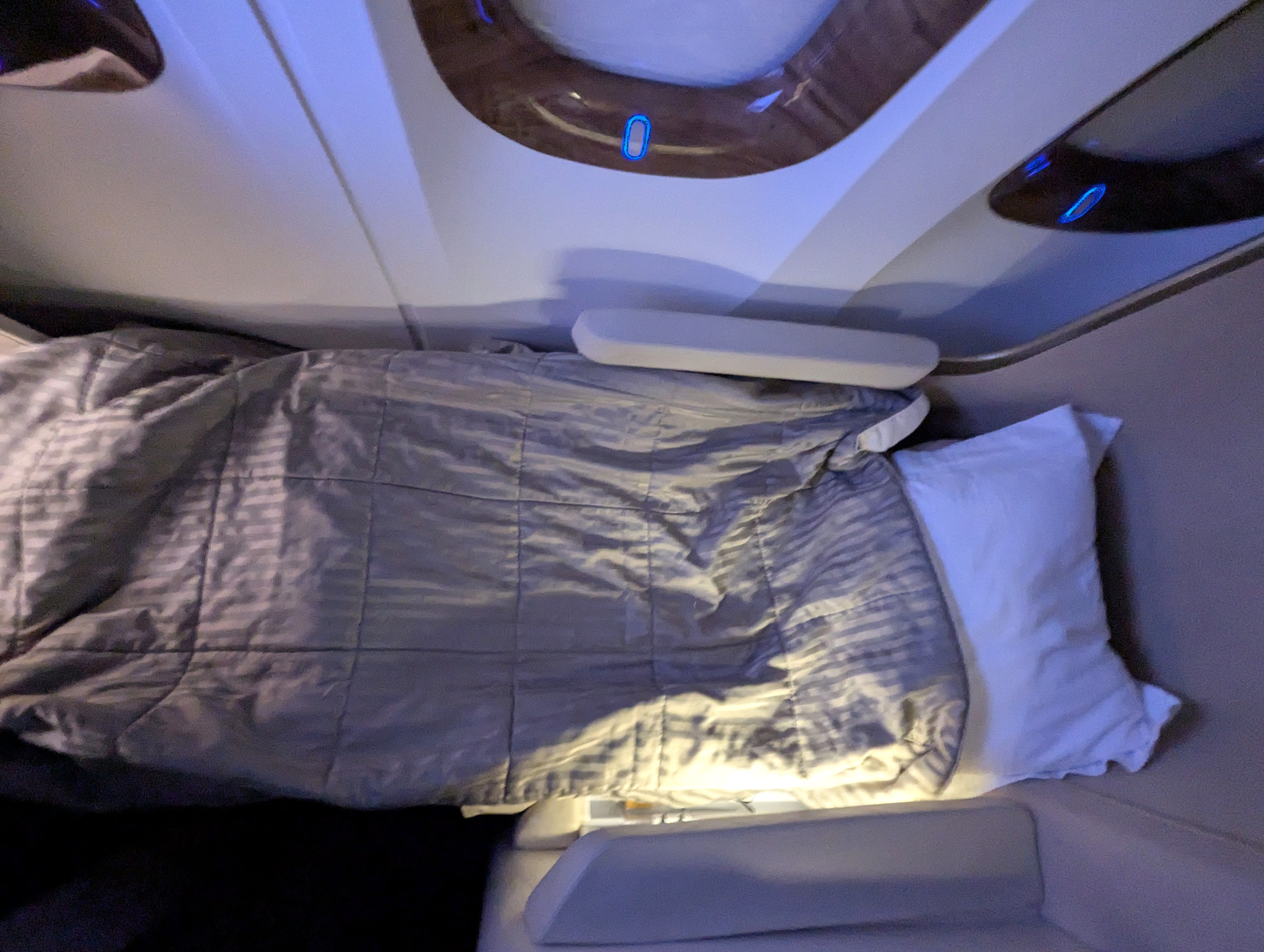 As I walked over to my seat, a flight attendant asked me if I wanted a mattress for my seat. I accepted the offer and she set my seat to a flat position and placed the mattress on it for me. The blanket provided was soft and comfortable and soon I was tucked in for some blissful moments of relaxation and sleep.