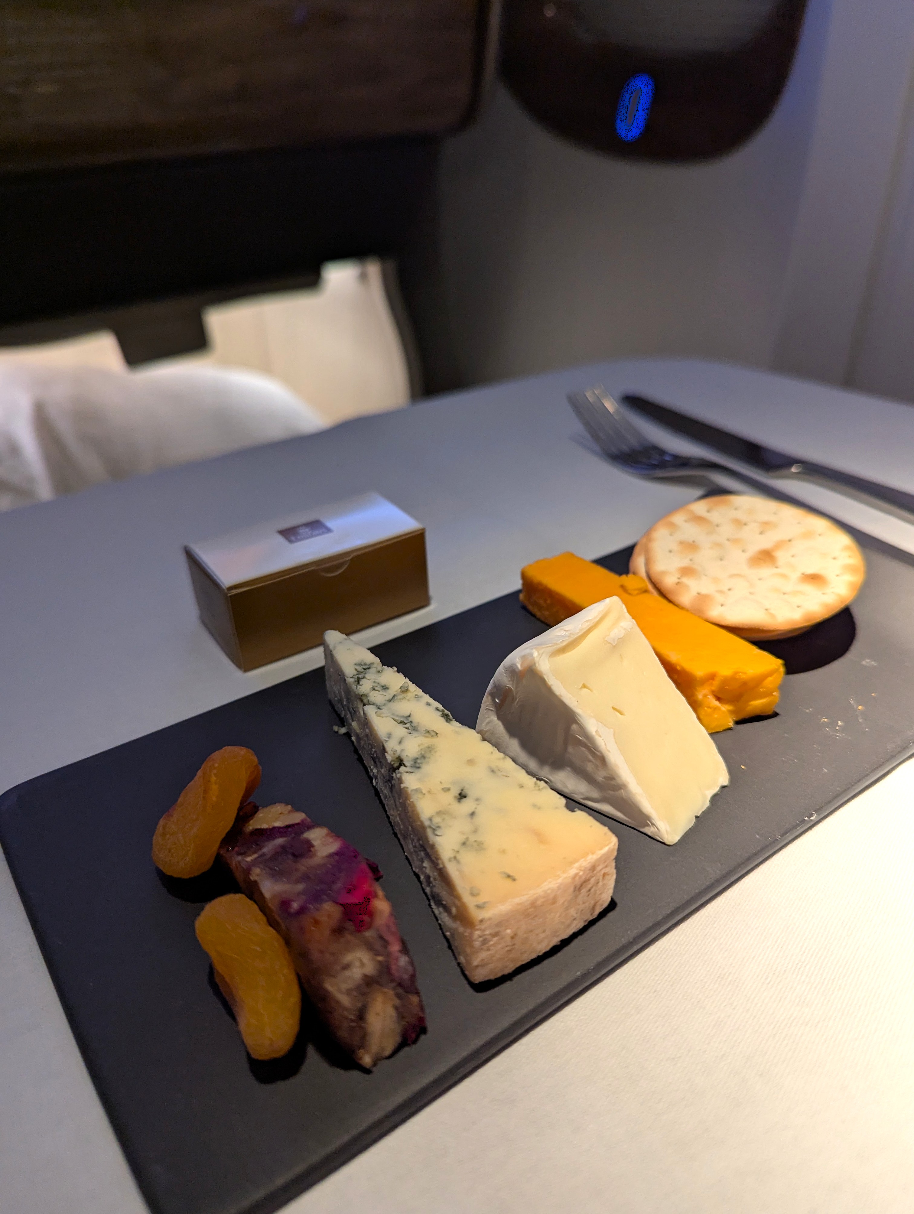 The menu offered several choices for the appetizer, main course and dessert. I opted for the cream of mushroom soup with paprika straws and it was delicious. I selected the grilled beef tenderloin for my main course and I am so glad I did. The beef was very tender and everything tasted great. The cheese plate I selected for dessert had a good selection of cheese and dried fruits, and the chocolates served on Emirates Airlines are some of the best kinds I have had.