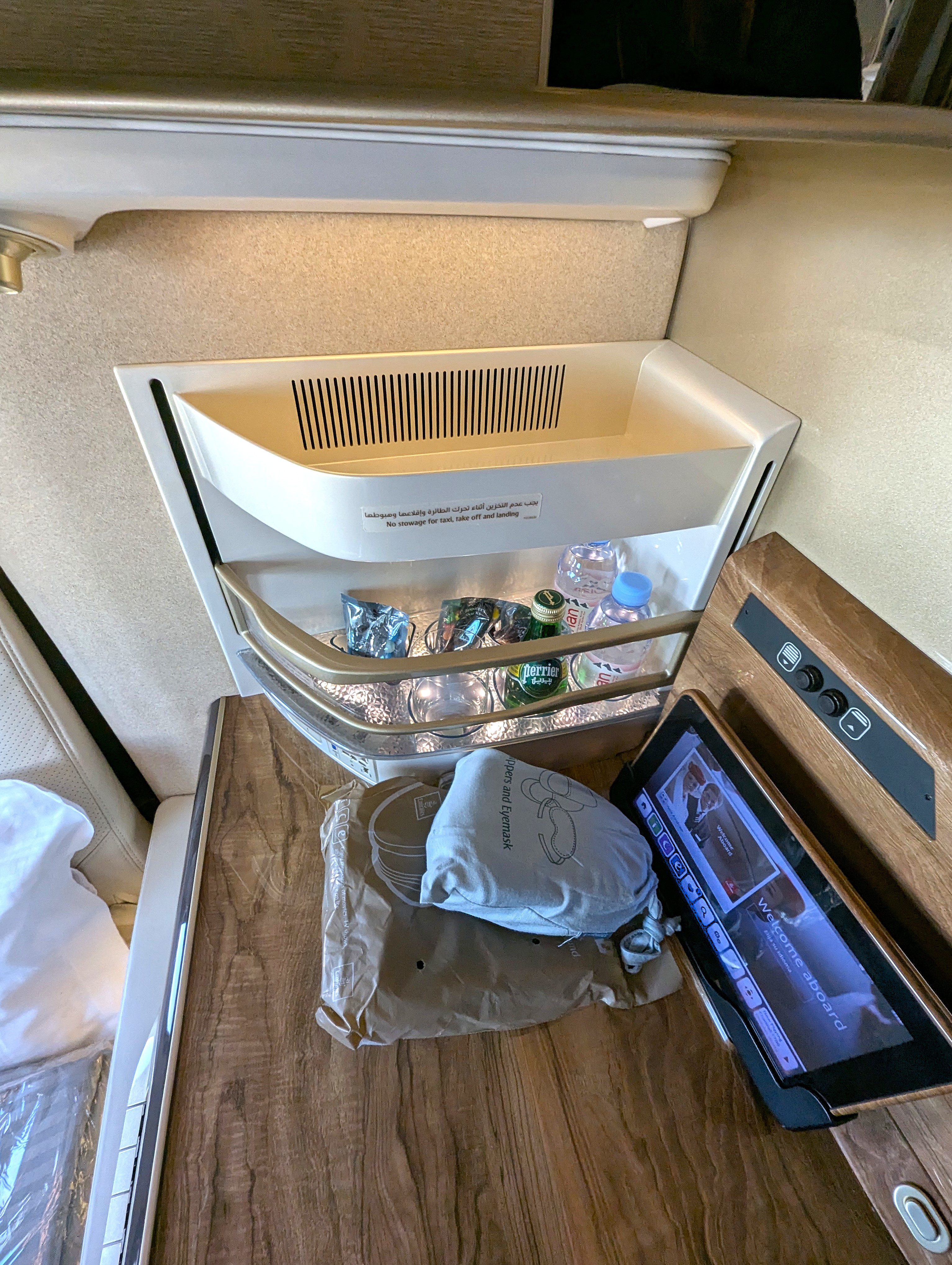 It is always a pleasant experience to see a 1-2-1 layout of the business class seats. The large seat pod with a comfortable seat, sizeable footwell space, numerous storage bins, power outlets with different configurations, a mini bar with snacks and drinks, and other amenities makes Emirates so special to me. The seat in business class is soft and supportive and can be adjusted to the right ergonomic feel. The blankets and mattresses are very comfortable and makes for a cozy flight experience. Slippers were provided along with noise cancellation headphones in a sealed plastic bag.