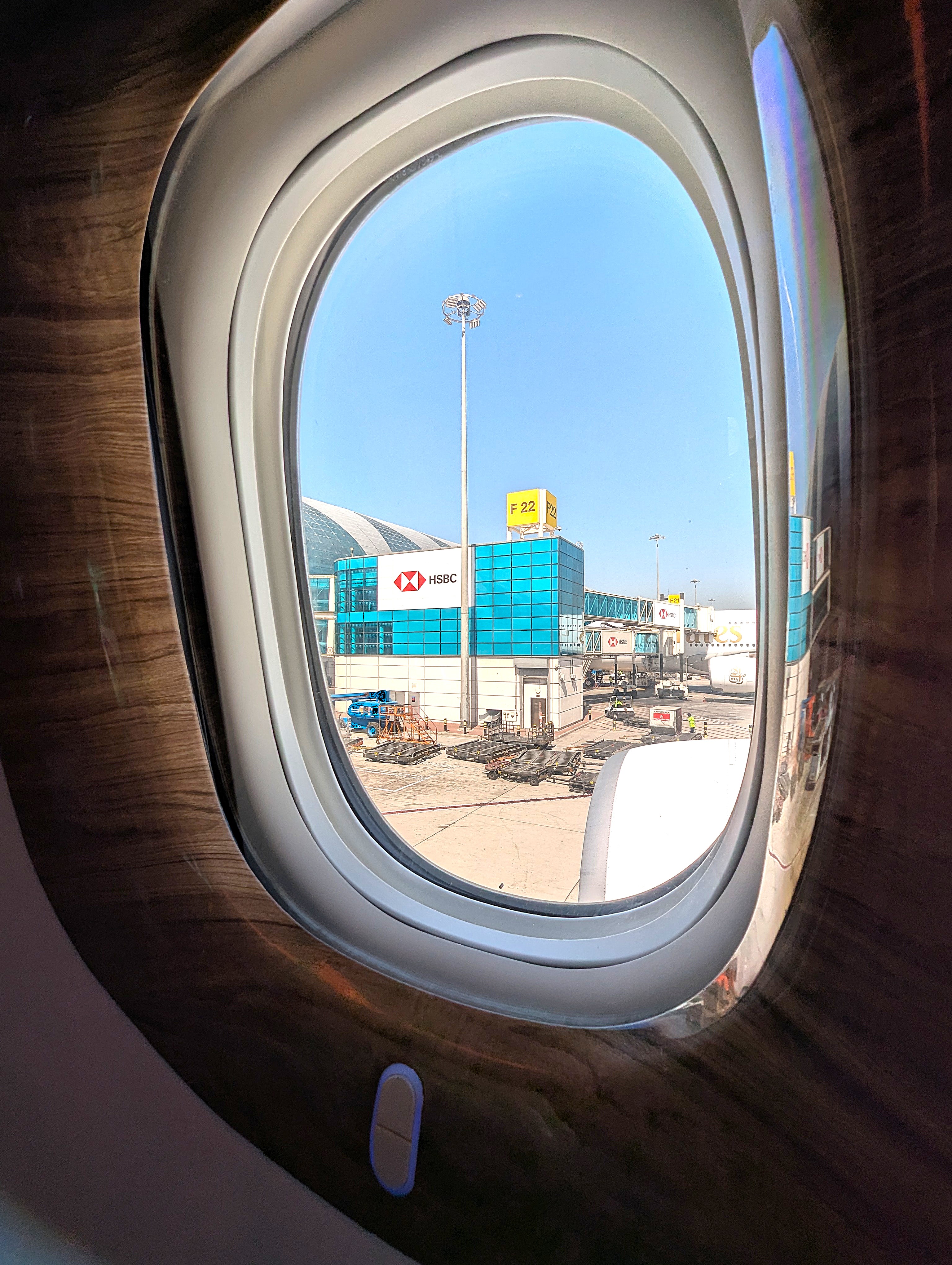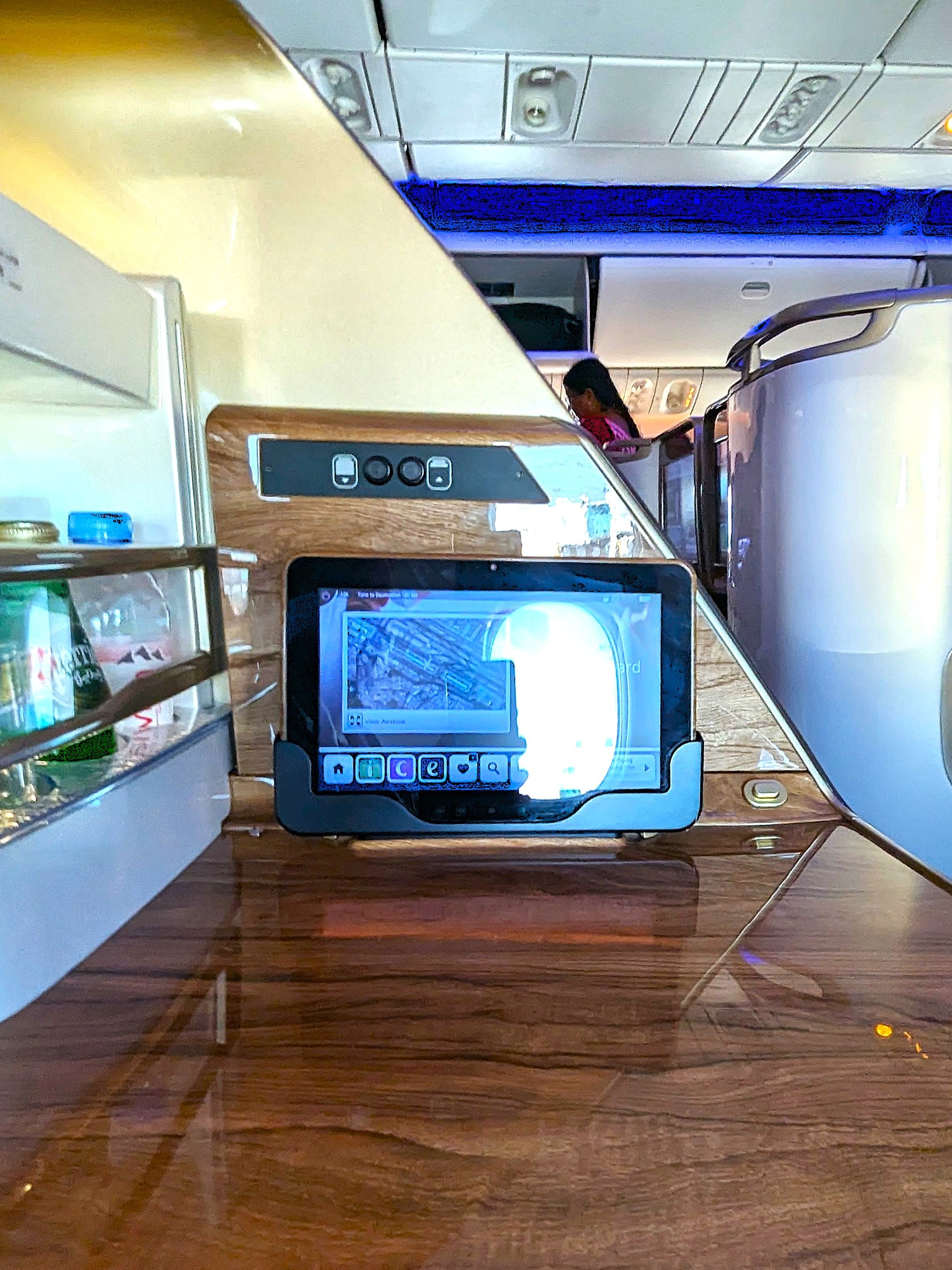 The entertainment system screen in business class is quite large and includes a touchscreen interface. The entertainment system can also be controlled by the tablet console which comes off from its holder at the press of a button. The tablet can also be used to watch movies instead of the screen in front of the seat. One of the nice touches is the availability of physical control buttons placed right next to the seat to control lighting, volume, seat adjustments, etc. This is so convenient that it should be an industry standard. In other airlines, I have had confusing and frustrating moments trying to figure out where things were and how to use them. I have also noticed that the windows on Emirates Airlines are always clean and it makes it easy to take pictures or videos of the view outside.
